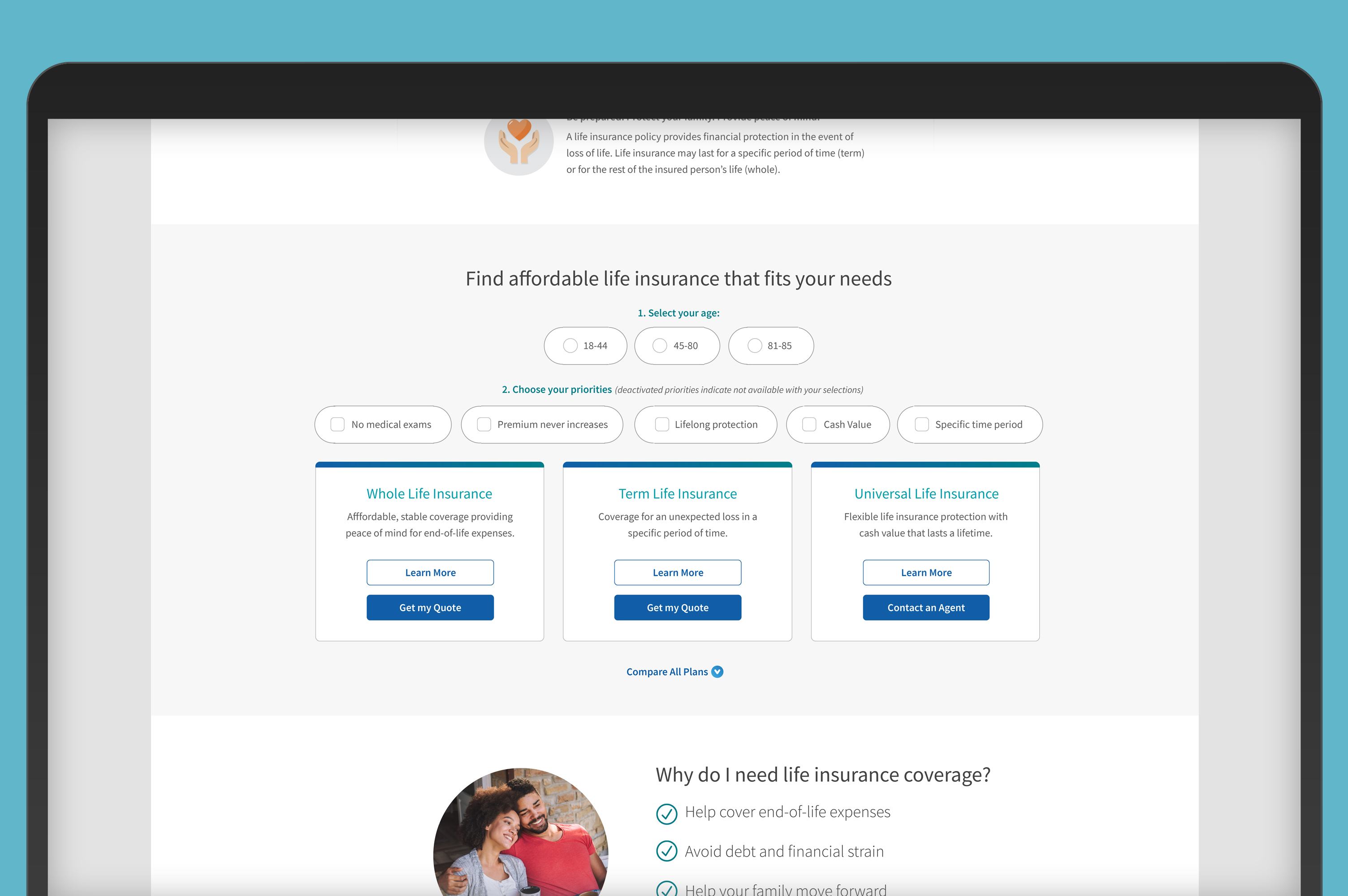 One of the most impactful pages we redesigned was the life insurance basics page. Some users want to get to a certain product quickly while others need a little bit of guidance to choose a product. We added a filter to this page that is designed to recommend a product and get users where they need to go quickly.